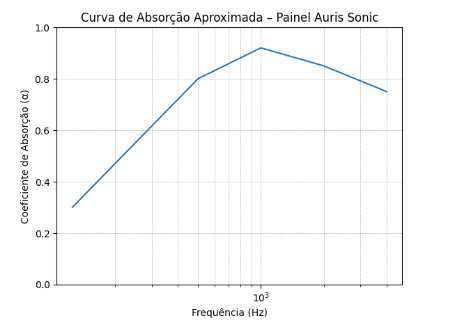 O Auris Sonic apresenta uma resposta de absorção cuidadosamente equilibrada, com atuação progressiva nas frequências médias e excelente eficiência na região de médio-graves — ponto crítico para o controle de salas.